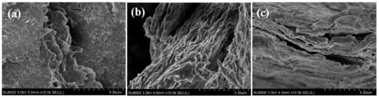 Scanning electron microscopy (SEM) micrographs of GO and the GO-based sorbents: (a) GO, (b) GO–CTS, and (c) GO–Al.