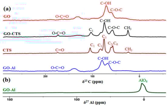 (a) Normalized 13C and 27Al solids NMR spectra of GO, chitosan and GO-based cross-linked composite (GO–CTS), and (b) 27Al NMR spectrum of GO–Al.
