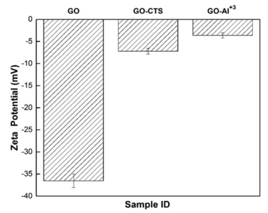 The zeta potential (ζ) values provide insight related to the nature of electrostatic bonding between the graphene surface of the GO-based samples and bound adsorbate species with variable electrostatic potential. Also, the magnitude of the point of zero charge (PZC) for the GO-based composite materials reflects the nature of the adsorptive interactions. The surface charge of the adsorbent phase (GO and GO-based composites) is influenced by the adsorption tendency and capacity from aqueous solution that contains the MB cation. Similarly, the uptake of gas species with variable polarity (N2 vs. H2O) is likely to affect the PZC of the adsorbent-gas system. The ζ-value for pristine GO (Figure 3) revealed a highly negative value (ζ below −30 mV) in its pristine form prior to cross-linking. This negative charge is mainly due to the polar and ionizing functional groups (–COOH and –OH) on the surface of GO sheets upon oxidation of graphite []. The ionization of –COOH and phenol (–OH) groups of GO may induce a stable colloidal suspension of GO sheets in polar solvents (such as water) due to favorable solvation and repulsive forces between the GO sheets []. The presence of such –OH and –COOH groups affords reactive sites for cross-linking of individual GO sheets with potential cross-linkers in aqueous media. As shown in Figure 3, the surface charge of unmodified GO was negative (−36.5 mV) prior to cross-linking. By contrast, the ζ-value was less negative for GO–CTS (−7.2 mV) and GO–Al (−3.6 mV) composite materials. The observed variation in the ζ-values upon cross-linking of the GO-based composites provides support that cross-linking of the surface functional groups of GO occurred. Electrostatic interactions between the positively charged ammonium sites of chitosan with the negatively charged sites of GO can lower the overall surface charge to yield a stable GO–CTS composite [,]. According to the ζ-value results for the GO sheets, it is expected that GO and its cross-linked forms (GO–Al and GO–CTS) will exhibit promising affinity toward cationic dye species such as MB across a wide range of pH values, especially near pH 7.