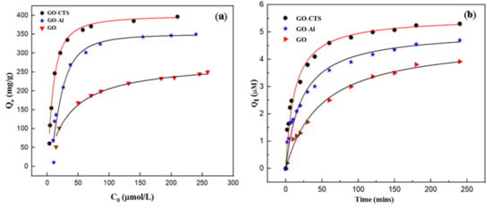 The MB equilibrium absorbance was used to estimate the uptake properties of GO and GO-based composites. Greater decolorization of MB in solution occurs during the adsorption process according to higher MB uptake of the sorbents (GO, GO–CTS and GO–Al) at pH ~6. The unique MB adsorption isotherms and monolayer uptake capacity (Qm) for the various sorbents are shown in Figure 4a.