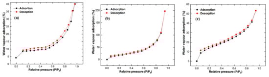 Water vapor adsorption and desorption profiles at 298 K: (a) pristine GO, (b) GO–Al composite, and the (c) GO–CTS composite.