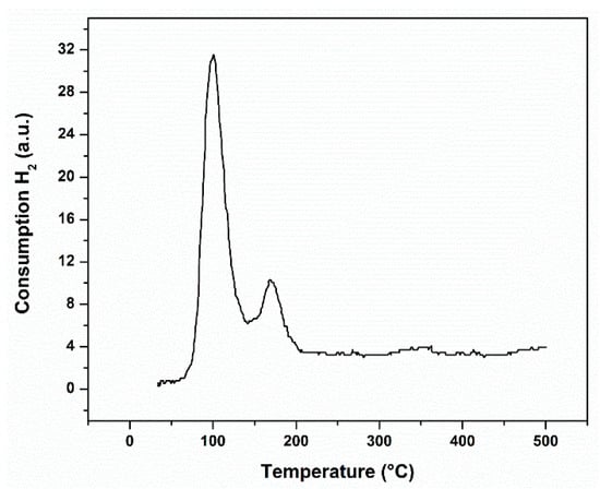 The reduction of the rhodium takes place at around 300 °C, according to the reduction profile at the control temperature; see Figure 1. There is no consumption of hydrogen at higher temperatures; therefore, the thermal treatments proposed guaranteed the total reduction of the metal. The peak of TPR at low temperature belongs to well dispersed Rh2O3, which is easily formed, while the peak of TPR at high temperature belongs to the reduction of crystalline Rh2O3 or larger particles of Rh2O3 [].