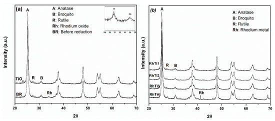 The XRD diffractograms of Rh/TiO2 catalysts (Figure 2a) show the main reflections, characteristics of the anatase-type structure (2θ: 25.3, 37.1, 48.2, 55.1, 62.20°), traces of the brookite phase (2θ: 30.8, 36.1, 37.2, 46.03, 48.3, 55.60°) and the rutile phase (2θ: 27.4, 36, 41.2, 54.30°). This mixture of phases is characteristic of catalysts synthesized from titanium terisopropoxide [].