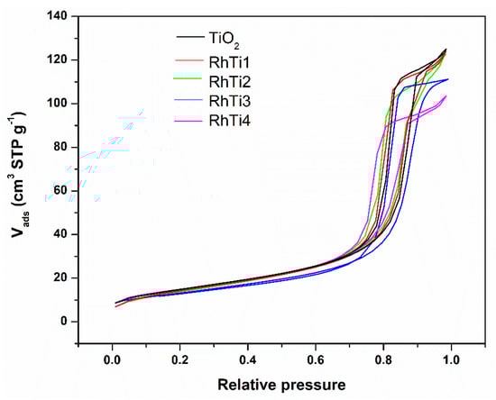The adsorption volume decreased for the RhTi3 and RhTi4 catalysts, and the pore diameter is reduced by the presence of metallic particles on the surface (see Figure 3). The surface area of the RhTi1 and RhTi2 catalysts is 2–4% less than that of TiO2, whereas it is 8–11% lower for RhTi3 and RhTi4 catalysts compared to TiO2, RhTi1 and RhTi2 (see Table 1).