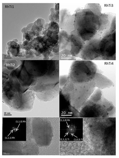 Rh particles on TiO2 supports can be seen clearly in Figure 4. Based on a measurement of 200 particles per catalyst, the mean particle sizes are estimated to be 1.09, 1.30, 4.1 and 8.10 nm for RhTi1, RhTi2, RhTi3 and RhTi4, respectively. The TEM images of catalysts RhTi1 and RhTi2 show that the rhodium particles are homogeneously dispersed on TiO2. The calculated particle sizes are characteristic of catalysts with a highly dispersed metallic phase and consequently a large metallic surface area. Rhodium particles in the RhTi3 catalyst have a larger diameter compared to the RhTi1 and RhTi2 catalysts, as shown in Figure 4. The micrograph of the RhTi4 catalyst shows large and heterogeneous particle sizes, which causes a low dispersion of the rhodium particles and low metallic surface area (see Table 1). The decrease of the heating rate from 2 to 1 °C min−1 decreased the particle size of Rh. It has been reported that the rhodium particles generated in a thermal reduction process at 500 °C are stable and maintain their size. On the contrary, in treatments of 300 °C, small particles can be obtained but tend to agglomerate in the cooling process []. However, when the maximum heating temperature was lowered from 500 °C to 300 °C, the particle size increased. Therefore, the differences observed in Rh particles are due to the thermal treatment performed on each catalyst. The analysis of the interplanar distances shows that rhodium particles smaller than 2 nm exhibit the planes (1,0,0) and (1,1,1), while when particles are larger than 3 nm, the plane (1,1,0) predominates, as shown in Figure 4.