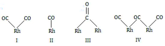A geminal dicarbonyl species (species I) exhibits two sharp infrared bands near 2030 and 2100 cm−1 which correspond to the symmetric and asymmetric modes of Rh(CO), respectively, possibly forming on the edge atoms of supported Rh “rafts” containing 7 Rh atoms []. Other types of site are linear monocarbonyl species (species II), with CO occupying a single surface site, which exhibits infrared of bands 2040 and 2075 cm−1 []; bridged carbonyl species (species III) CO between two adjacent metal atoms in the surface, which exhibit broad infrared band of 1840 and 1920 cm−1 []; and sometimes, the interaction of three molecules of CO with two particles of Rh (specie IV), which exhibits a broad infrared band between 1900–1920 cm−1 [].