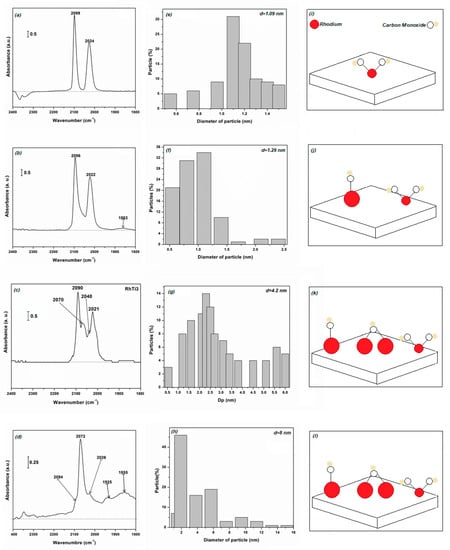 The analysis of Rh particle size and the type of specie was attributed to the distribution of the nanoparticles on the support (Figure 6). According to the histogram of the catalyst RhTi1 (Figure 6e), most of the particles have an average size of 1.1 nm; the rest were distributed in particle sizes of 1.2, 1.3, 1.4 and 0.6 nm. In the infrared spectrum of this catalyst, only an absorption band associated to specie I was observed. Therefore, this indicates that this interaction is characteristic of particles with diameters ≤1.5 nm, as illustrated in Figure 6i. For the RhTi2 catalyst, the highest percentage of metal particles was grouped around 1.1 nm, with 0.6 nm being the least common. In addition, 4% of particles in this catalyst were observed to have sizes ≥2 nm (Figure 6f). If specie II occurs in large particles (>2 nm), these are not abundant in the RhTi2 catalyst, and so a weak infrared signal should be expected.