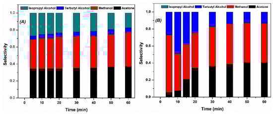 Selectivity of the products identified in the MTBE oxidation reaction. Highly dispersed catalyst (A), low dispersed catalyst (B).