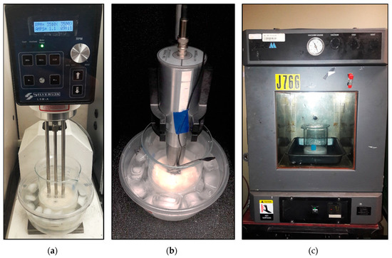 The resin modification process started by drying the clay for two hours in a vacuum oven at 55 °C to remove moisture. All additives were then mixed into the resin for one hour with a Silverson L5M-A (Silverson Machines, Inc., East Longmeadow, MA, USA) high shear mechanical mixer set at 3500 rpm. The solution was then sonicated for 30 min using a Qsonica Q700 sonicator (Qsonica, Newtown, CT, USA), because it is an essential stage for obtaining the clay platelets’ exfoliated structure [32]. The beaker was placed into an iced water bath to evacuate the generated heat during these steps. Finally, resin was degassed to remove air bubbles introduced by mixing and sonication. Prior to degassing, the resin was heated at 55 °C to lower its viscosity and facilitate bubble migration. These steps are illustrated in Figure 1. Once the resin was ready, hardener was added according to the ratio advised by the supplier and mixed manually.