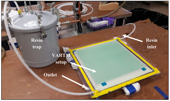Unidirectional laminates were prepared by vacuum-assisted resin transfer molding (VARTM) method with the modified resins prepared above (Figure 2). Ten plies of TC-09-U unidirectional high modulus carbon fiber from Texonic Inc. (Saint-Jean-sur-Richelieu, QC, Canada) were used to obtain a [+45]10 laminate with a final thickness of 3 mm. As illustrated in Figure 3, VARTM method consisted of using a vacuum to infuse the carbon fabric with the resin.