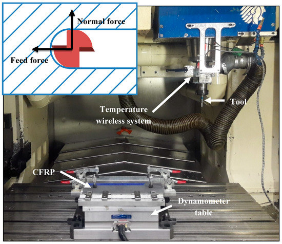 All laminate’s widths were trimmed at 300 mm by a circular diamond saw prior to being machined. Fully engaged tool milling tests were performed on a Huron K2X10 three-axis CNC (computer numerical control) machine (HURON, Strasbourg, France) in dry cutting conditions (Figure 4). Fiber orientation of −45° was chosen, since it produces the worst cutting mechanism case by causing frequent damages such as fiber pull-out, uncut fibers, and matrix cracking [5,6]. The machining fixture was mounted directly on a Kistler 9255B three-axis dynamometer (Kistler, Winterthur, Switzerland) to record cutting forces at a 48 kHz sampling. According to a previous study on the current tool [33], cutting speed was fixed at 400 m/min and feed rate at 0.254 mm/rev, these parameters have been found to optimize cutting conditions.