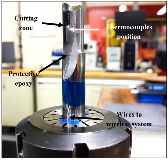 Two identical PCD tools were employed, one for each experimental series. Geometrical specifications are given in Table 2. PCD material was chosen to prevent wear effects on cutting forces and temperatures and show best tool life. Type-K thermocouples (from Omega, Norwalk, CT, USA) were bonded on both tool teeth with thermally conductive cement (Omegabond 400 also from Omega) to ensure good linkage (Figure 5). The cement was covered with an epoxy glue to protect it from separating. The smallest wire diameter available (0.08 mm) was used, to minimize response time. Thermocouples were also in stalled at 1.7 mm from the first CFRP ply, which was determined as the minimum distance that prevents separation [11]. Temperature data were obtained by a wireless thermocouple measurement system integrated in a special mandrel (M320 from Michigan Scientific Corporation, Milford, MI, USA).