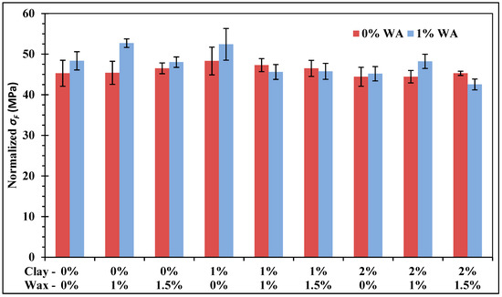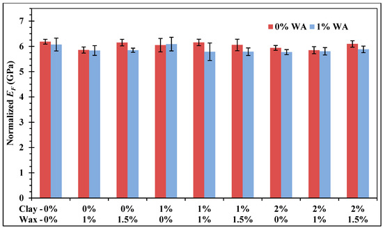 Flexural tests were performed on both experimental series, with and without wetting agent. Normalized flexural strength and stiffness are shown in Figure 7 and Figure 8, respectively. For both flexural strength and stiffness, no trend between mechanical properties and filler concentrations was distinguishable, no mathematical modeling was found either. Indeed, all samples showed relatively close values, and only a few samples were found to be significantly different from others by the ANOVA. Comparatively to the neat epoxy, a significant improvement in strength was observed for the sample with 1% wax and 1% WA. This result was not expected since wax is not known to improve mechanical properties, but is ordinarily only used for lubrication needs [27,28]. However, this sample did not lead to the same improvement on stiffness, whereas the neat epoxy remained statistically equal or stiffer than others. Variations between both experimental series were seen on strength, which means that WA may have interactions with clay and wax, in contrast to stiffness, where WA has no influence. Mechanical properties are generally improved in polymers by the addition of particles which help to block the deformation under load [28]. Such a behavior was expected from clay, which was expected to increase mechanical properties more significantly, as observed by others [19,20,21]. This was not due to interaction with other fillers, because even samples with only clay/epoxy were not changed. It might be due to the kind of phyllosilicate present in the current additive. More experiments should be carried out with other organoclay additives to confirm this hypothesis. However, despite the three filler addition, almost none of the samples showed significant decrease of the flexural properties.