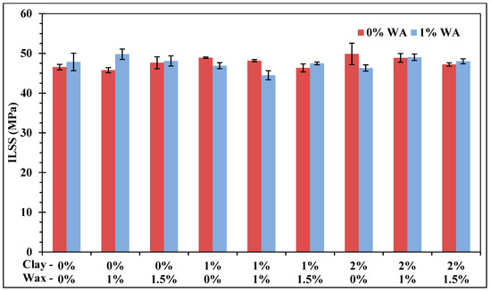 Short-beam tests were performed in order to investigate the effects of fillers on the fiber–matrix interaction. ILSS are presented in Figure 9 with and without WA, data are not normalized here since short-beam strength is not a fiber fraction dominated value [36]. Contrary to flexural tests, clay has been shown to have a tendency to increase ILSS. Comparatively to the neat epoxy, an addition of 1% clay led to a significant ILSS improvement of 5%. Similarly, 2% clay gave the best results despite the large uncertainties. Organoclays are well known to provide a better bonding between fiber and matrix and the present observation joins the conclusions made by other studies [19,26]. However, as presumed before, WA have an interaction with clay, since the same concentrations were not statistically different to the reference in the second experimental series. As observed for flexural tests, the sample with 1% wax and 1% WA is also statistically significant on ILSS.