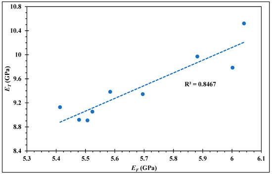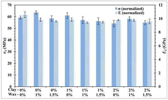 Tensile tests are generally useful to determine the intrinsic mechanical properties of a material [35]. Tensile tests were performed on the 1% WA experimental series. Figure 10 shows normalized stresses and chord modules of elasticity. These tests revealed conclusions close to the flexural ones. Both showed similar trends and the ANOVAs revealed the same significant samples as previously, such as the sample with 1% wax and 1% WA, which also improved tensile strength. The similarity between both tests can be seen in Figure 11, where a positive correlation between the flexural and tensile chord modulus of elasticity appears. This observation is explained by the traction-compression, which occurs into flexural specimens while bending. Other authors have demonstrated the possibility to estimate tensile properties through the flexural test, which is easier to perform [41,42]. Due to this high correlation, as well as time and economic issues related to this university–industry partnership study, the implementation of the tensile tests were not performed on the 0% WA experimental series. As proposed by the industrial partner, this study aims to investigate the effect of fillers on CFRP. Thus, flexural tests alone are enough to have a preview of fillers’ effect on mechanical properties in the present study. Deeper measurements of tensile properties will be done in further studies.