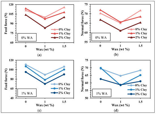 Cutting forces changes with fillers without (a,b) and with (c,d) wetting agent (WA).