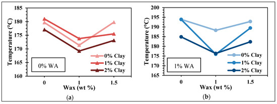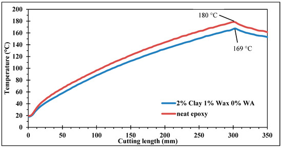 Given that all CFRP laminates were trimmed precisely at the same width, the final temperatures measured (at a cutting length of 300 mm) were thereafter used to compare samples. An influence of fillers on temperatures was visible (Figure 14). Both experimental series had the same tendencies but were shifted by about a few degrees. No interactions of wetting agent on temperatures can be asserted, the lag between the series with and without wetting agent can be explained by a tool change. Two identical tools are used for this study, one for each experimental series. Due to their tiny size, thermocouples are difficult to place precisely on the tools. Thermal responses are, hence, slightly different between both tools. However, variations in each experimental series are confident since the tool used did not change. Independently of WA, lower temperatures were nevertheless observed for all the combinations that had a concentration of 1% wax or 2% clay. As noticed for forces, the best improvements on temperatures were obtained by the samples with 1% wax and 2% clay. Drops of 11 °C and 18 °C, respectively, were observed for the 0% WA and 1% WA series with this combination.
