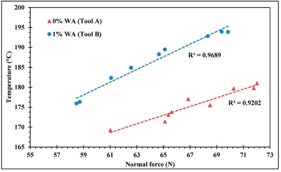 Temperatures seem to follow the same trends as normal forces. To investigate this relation, temperature as a function of normal force is traced in Figure 15. Temperatures are clearly separated into two groups, depending on the experimental series. As explained previously, both tools used are identical but the groups formed are due to the difference in thermocouple response. The more suitable hypothesis is that even if thermocouples were bonded with care, they probably were situated a bit closer to the surface of the tool. Thus, tool B used for the 1% WA series presumably had a better thermal bonding with the thermocouples than tool A. This hypothesis explains why higher temperatures are obtained with WA. A strong correlation exists between temperatures and forces. Temperatures increase linearly with normal forces. This result allows confirmation of the hypothesis that heat is mainly produced by friction, which is commonly assumed in CFRP machining [7,8]. This also helps to understand how temperatures are decreased. Fillers actually have no direct effect on temperatures, but they do on forces. By decreasing the forces, lower temperatures are obtained.