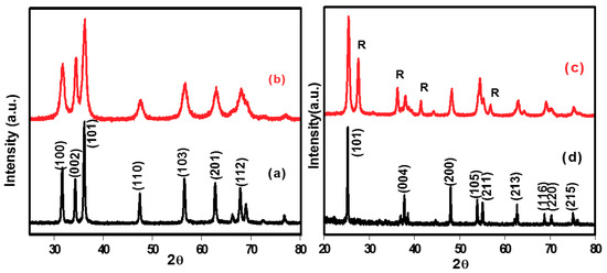X-ray diffraction (XRD) of (a) Pristine ZnO, (b) FL–ZnO, (c) FL–TiO2 and (d) Pristine TiO2.