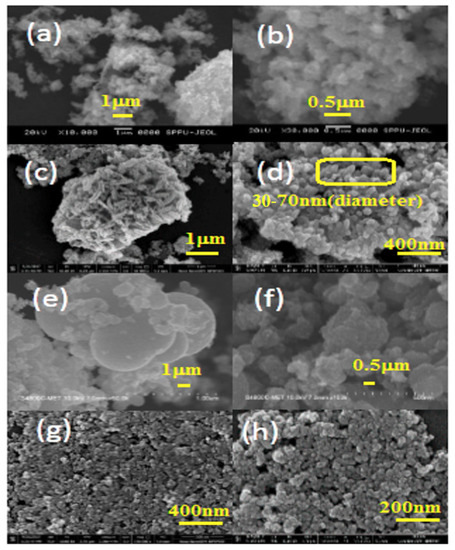 Field emission scanning electron microscopy (FE-SEM): (a,b) Pristine ZnO, (c,d) FL–ZnO, (e,f) Pristine TiO2 and (g,h) FL–TiO2.