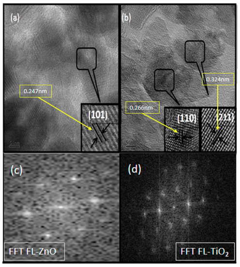 The fast Fourier transformation (FFT) gives the information of the lattice fringes on HRTEM image and it can use to index the observed spots. In given Figure 4c,d corresponding to the fast Fourier transmission (FFT) pattern of the nanoparticle is closed to single crystalline. From these observations, it is reasonable that the as-prepared ZnO and TiO2 nanoparticle is of nanocrystalline structures, which means that they are constituted by well-crystallized ZnO and TiO2 nanoparticles.