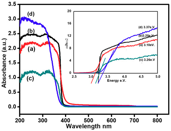 The Ultra-Violet diffuse reflectance spectra (UVDRS) of pristine ZnO, TiO2, FL–ZnO and FL–TiO2 were shown in set of Figure 5. It was calculated from a UV-Visible spectrum and Tauc’s plot. All these materials showed absorbance in a range of 350–400 nm. The calculated band gap of FL–ZnO nanoparticles in presence of FL at 3.10 eV and pristine ZnO is 3.26 eV. More is the oxygen defects lower is the band gap [27]. Deviation in the band gaps of FL–TiO2, and pristine TiO2 was observed in curves b and d in Figure 5. FL–TiO2 showed the band gap of 3.20 eV while pristine TiO2 has band gap of 3.37 eV.