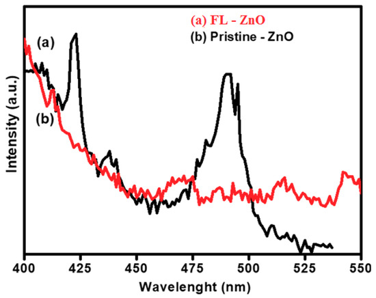 Photoluminescence spectra of ZnO materials excited at 390 nm excitation wavelength (a) FL–ZnO and (b) Pristine ZnO.