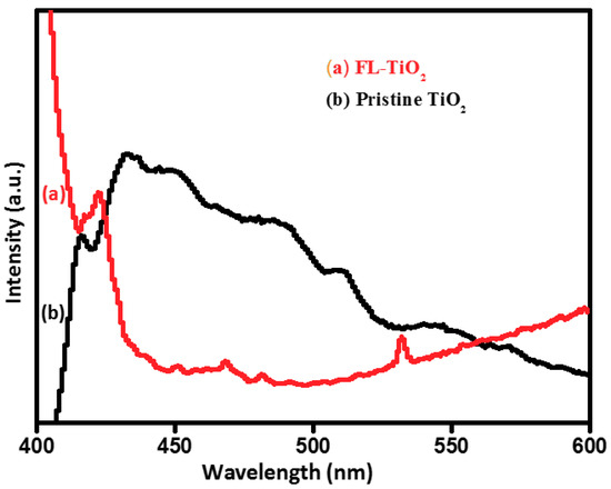 Photoluminescence spectra of TiO2 material excited at 395 nm excitation wavelength (a) FL–TiO2 and (b) Pristine TiO2.