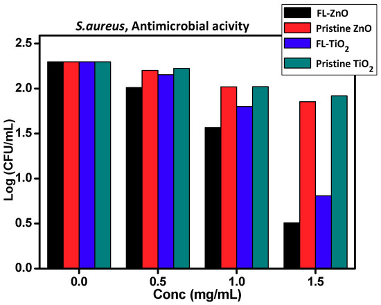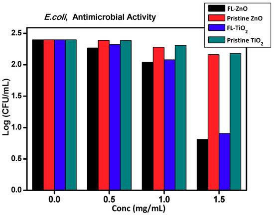 As can be observed, FL–ZnO and FL–TiO2 nanocomposites showed a better antimicrobial activity than pristine ZnO and TiO2 nanoparticles. The nanocomposites were more effective on cells of S. aureus than on cells of E. coli. The antimicrobial action of FL–ZnO and FL–TiO2 nanocomposites were concentration dependent. When the cells of E. coli and S. aureus were independently subjected to various concentrations of ZnO and TiO2 nanoparticles and FL–ZnO and FL–TiO2 nanocomposites, there was a decrease in the number of viable cells. An initial 2.4 log CFU/mL was reduced to less than 0.5 log CFU/mL in presence of FL–ZnO and 0.7 log CFU/mL in presence of FL–TiO2 nanocomposites. However, the log CFU/mL in presence of pristine ZnO and TiO2 nanoparticles were respectively, 2.2 and 2.1. The reduction was more prominent in presence of FL–ZnO and FL–TiO2 nanocomposites. The colony count of E. coli and S. aureus, in presence of FL–ZnO and FL–TiO2 nanocomposites also, was less (Figure 10). Small particles size of material showed enhancement in the bioactivity because increased in surface area to the volume ratio. The smaller particles can easily bind higher number of bacterial colonies which result in the large number of active oxygen species to burst the cell wall of the bacteria also the structural defects, oxygen defect and oxygen interstitials help to increase the antimicrobial activity of nanomaterial of FL–ZnO and FL–TiO2. Whereas, pristine ZnO and TiO2 nanoparticles have agglomeration, bulky size and less surface to the volume ration can decreases contribution to the antimicrobial activity [50].