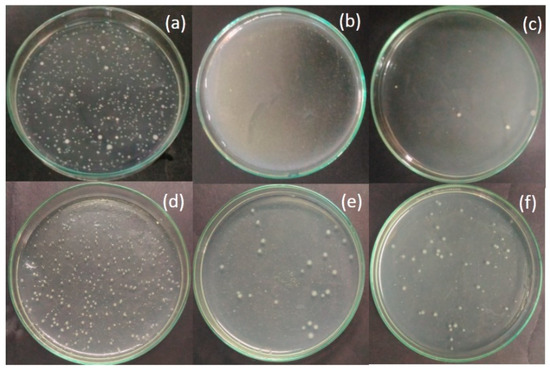 Antimicrobial activity of E. coli and S. aureus against TiO2 and ZnO nanomaterials. (a) Control of S. aureus; (b) FL–ZnO against S. aureus; (c) FL–ZnO against E. coli; (d). Control of E. coli; (e) TiO2 against S. aureus; (f) TiO2 against E. coli.