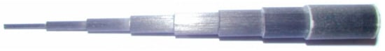 This hybrid composite material is relatively easy to machine. Samples of various geometric shapes (cylindrical or rectangular bars, powder, etc.) were taken in different parts of the rod, thus offering the possibility of studying separately the different constituent materials. As an example, the glass-fiber shell was totally removed from the rod to be separately characterized from the carbon-fiber core before and after thermal ageing. In addition, steps of about 0.5 mm in height were machined in the diameter of the carbon-fiber core (Figure 2) and a small amount of powder was then taken at the surface of each step in order to determine the gradients of chemical structure and physicochemical properties throughout the rod diameter before and after thermal ageing.