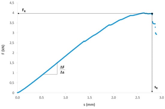 Three important characteristics were determined graphically from the load-displacement curve of Figure 3: The maximal slope of the elastic regime (ΔF/Δs), the breaking load (FR), and the breaking sag (sR). The values of the bending modulus E and the breaking stress σR were calculated by applying the following classical formulas: