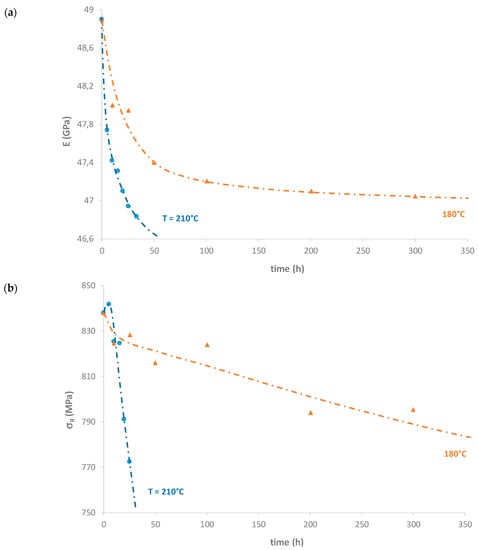 The thermal ageing of the composite rod between 180 and 210 °C in nitrogen or ambient air leads to a drop in E and σR from the early periods of exposure, as shown in Figure 4. However, this drop is less marked for E than for σR. As an example, E decreases by about 4% after 25 h at 210 °C or 300 h at 180 °C, while σR decreases by about twice (i.e., 8%). In addition, the drop in E is strongly slowed down, while it remains almost linear for σR. The damage causing this peculiar mechanical behavior will be examined in the following section.