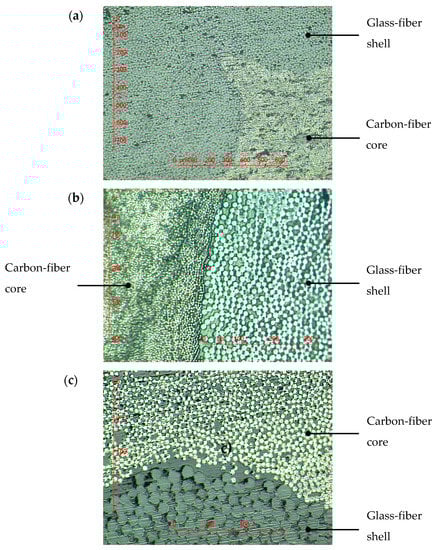 First of all, Figure 5 reports examples of micrographs of the radial cross section of the as-received composite rod. These micrographs were taken at random in the interfacial region between the carbon-fiber core and the glass-fiber shell at three different magnifications (×5, ×10, and ×20). It can be clearly seen that the interface separating both materials is not perfectly circular but very sinuous due to the deposition of pre-impregnated glass-fiber wicks over the carbon-fiber core during the pultrusion process. In the two constituent materials, fibers appear to be fairly homogeneously distributed, although some small rich-matrix regions can be observed here and there.