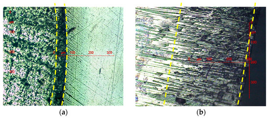 Between 180 and 210 °C, thermal ageing in ambient air leads to the formation of a superficial oxidized layer in the free edge of the glass-fiber shell, of which the thickness depends closely on the ageing temperature and fiber orientation, as already observed for other types of unidirectional composite material, in particular made of epoxy-diamine matrix []. The oxidized layer appears as a darker area than the unaffected parts of the glass-fiber shell. For a better visualization, this layer was delimited with yellow dotted lines on micrographs.