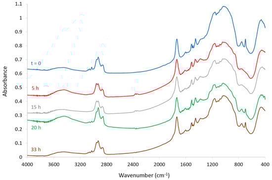 IR spectra of the outer surface of the glass-fiber shell before and after several durations of thermal ageing at 210 °C in ambient air.