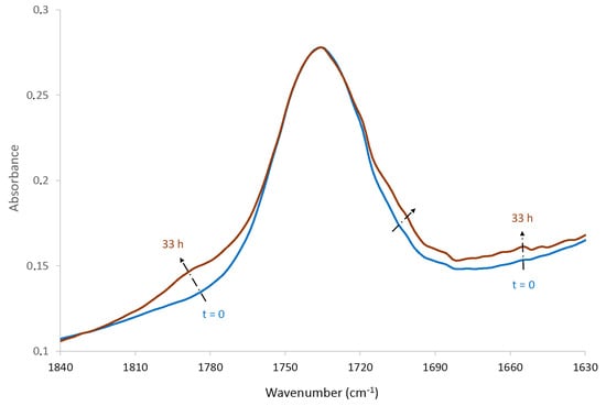 The only chemical modifications that were detected by FTIR spectrometry for the epoxy-anhydride matrix occurred in the oxidized layer of the glass-fiber shell. As shown in Figure 10, a broadening of the base of the ester band was observed due to the appearance and accumulation of new carbonyl groups during the course of oxidation. The shoulder centered at 1785 cm−1 can be attributed to new anhydride groups resulting from the condensation of carboxylic acids []. In contrast, the different shoulders centered at 1710, 1700, and 1690 cm−1 can be attributed to a large variety of other types of (saturated and unsaturated) carbonyl groups, for instance, aldehydes, carboxylic acids, and ketones. The formation of unsaturations is attested by the raising of the baseline between 1630 and 1670 cm−1.
