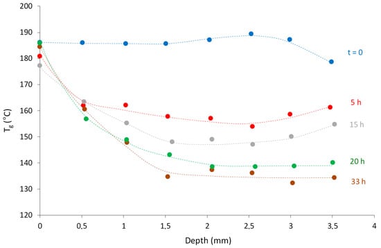 In contrast, DSC was very useful to evidence the consequences of thermal degradation on the structure of the macromolecular network and, in particular, to reveal the inhibiting effect of oxygen on thermolysis. As an example, Figure 11 shows the changes in Tg at different depths in the rod diameter during the course of thermal ageing at 210 °C in ambient air.