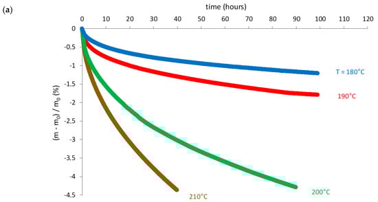 - As expected, thermolysis leads to nonnegligible mass losses. As an example, the carbon-fiber core loses about −1% after a hundred hours in nitrogen at 180 °C and more than 4% after only a few dozen hours in nitrogen at 200 and 210 °C (Figure 12a). Thus, thermolysis is clearly thermo-activated.