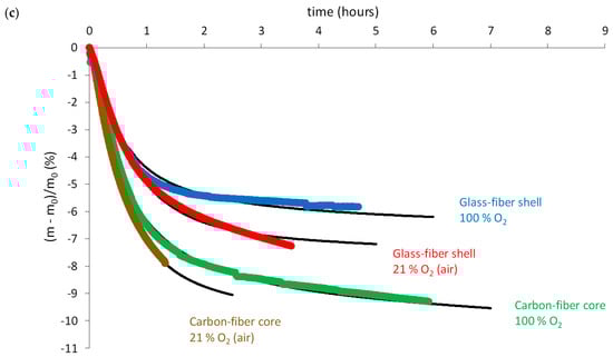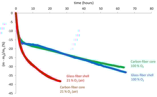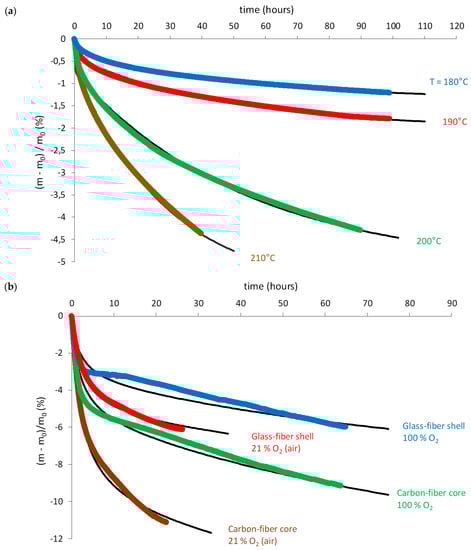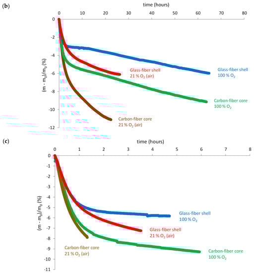 Finally, thermogravimetry was very helpful for analyzing and elucidating the general trends of the thermal oxidation kinetics. Figure 12 shows some examples of mass changes in various nitrogen/oxygen gas mixtures between 180 and 210 °C of powder samples taken in the carbon-fiber core or glass-fiber shell.