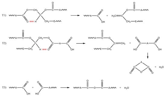 Table 4. Minimum values of Tg determined after long-term thermal ageing at 180 and 210 °C by DSC in the carbon-fiber core of the composite rod. - Thermolysis presumably consists of the thermal rearrangement of ester groups, a well-known reaction for linear polyesters [,,]. Indeed, this reaction would lead to the formation of terminal carboxylic acids and double bonds. Then, the resulting carboxylic acids could condensate into anhydrides. All these chemical events are summarized in the mechanistic Scheme 1. They can explain the formation of a large part of the degradation products detected by FTIR spectrometry. It should be emphasized that the second chemical event (denoted T2 in Scheme 1) is assumed to generate volatile compounds such as cyclic anhydrides and water. It is in competition with the condensation of carboxylic acid chain ends, leading to the formation of new covalent bridges in the macromolecular network (see event T3 in Scheme 1).