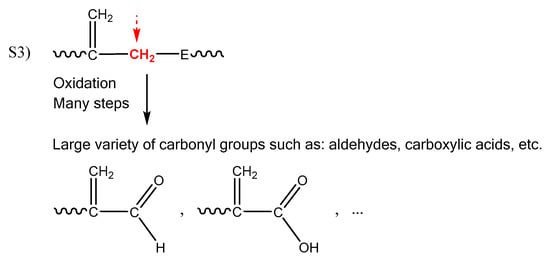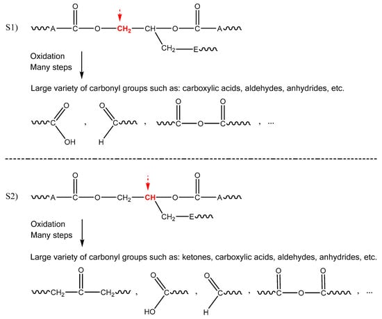 where Es, Ac, F, An and PH account for esters, carboxylic acids, unsaturations, anhydrides and oxidation sites, respectively. The first step brings together the two chemical events T1 and T2 previously detailed in Scheme 1. This step leads to the consumption of sites S2 and S1 and to the formation of allylic hydrogens as new reactive sites (of type S3; see Scheme 3) and are, thus, taken into account in the calculation of the global yield in reactive site PH. Finally, it produces small diacid molecules V0 of molar mass MV0 with a yield υ0. In contrast, the second step corresponds exactly to the last chemical event T3 of Scheme 1, producing water.