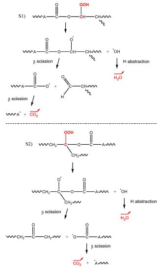 - In general, volatile compounds are formed in the initiation steps of oxidation. As an illustration, mechanistic Scheme 4 reports an example of a chemical event leading to the generation of two volatile compounds (water and carbon dioxide) during the unimolecular decomposition of hydroperoxides POOH, beforehand formed on sites S1 and S2. It should be specified that the rearrangement by β scission of alkoxy radicals PO● occurs preferentially on the weakest bonds of the macromolecular skeleton, i.e., on the O–C bonds, which are characterized by a dissociation energy of only ED ≈ 340 kJ·mol−1 [].