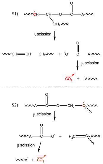 - Finally, a value higher than the molar mass of carbon dioxide (i.e., 44 g·mol−1) was found for υ1MV1, thus suggesting that volatile fragments heavier than carbon dioxide are also formed during the rearrangement by β scission of alkoxy radicals PO●. A more detailed knowledge of the chemical structure of the epoxy-anhydride matrix would be necessary to identify these volatile fragments and to propose a possible mechanistic scheme for their formation.