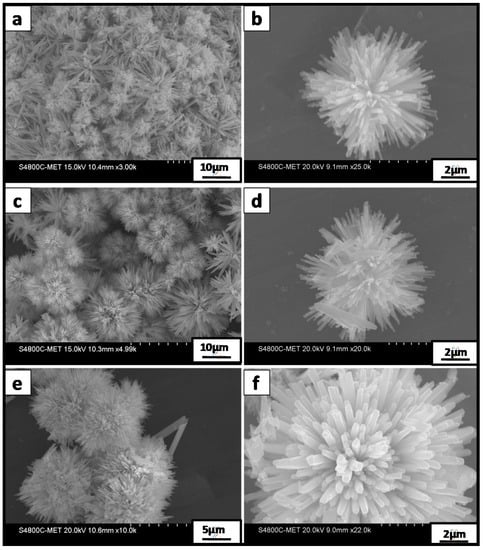 Figure 2 shows typical FESEM micrographs of SrS/Bi2S3 synthesized at 180 °C for different reaction durations for morphological investigation. Figure 2a,b show the FESEM of sample S1, which shows the formation of a hierarchical flower-like structure containing nanorods with diameters of about 40 ± 5 nm, as well as hierarchical urchin-like micro-nanostructures having sizes of 3 ± 0.5 µm. Figure 2c,d are the images of sample S2 prepared at 12 h, which show uniform urchin-like micro-nanostructures having nanorods with lengths of 3.5 ± 0.5 µm and diameters of 40 ± 5 nm. When the reaction was prolonged to 18 h, urchin-like nanostructure flowers, as in Figure 2e,f, of size 4 ± 0.5 μm were formed by the self-alignment of nanorods of diameter 75 ± 5 nm. Phase formation of SrS took place in sample S3 and the intensity of peaks for SrS was increased in sample S3 than S2, which was observed in XRD and further confirmed via TEM. The flowers obtained are well defined and the self-alignment of nanorods is well separated, as compared to the S1 and S2 obtained within 6 h and 12 h. It is quite obvious to have bigger flowers with a higher diameter of nanorods because the crystal growth is favoured due to prolonged reaction time via the Ostwald ripening phenomenon [].