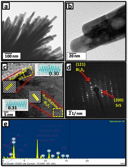 Figure 3 shows the high-resolution TEM (HR-TEM) images of an individual hierarchical SrS/Bi2S3 nanostructure with urchin-like morphology (sample S3). Figure 3a shows a characteristic TEM image of a SrS/Bi2S3 nanoflower composed of self-assembled nanorods. The HR-TEM of the sample S3 nanorod is shown in Figure 3b, having a rod size in the range of 50–80 nm. From the TEM images, the diameter of rods was observed to be consistent with FESEM investigations. Figure 3c, which shows the clear lattice fringes with d-spacing, reveals that the crystalline Bi2S3 nanoflower with lattice spacing of 0.31 nm, corresponding to the (121) plane (JCPDF card: 00-043-1471) of orthorhombic Bi2S3, is directly connected with the (200) plane (JCPDF card: 00-008-0489) of cubic SrS nanorods with lattice spacing of 0.30 nm. The  selected area electron diffraction  (SAED) pattern (Figure 3d) further confirms the crystalline nature of the nanostructures and the calculated d-values are in good agreements with the XRD data. The uniform distribution of Sr and S Energy Dispersive X-Ray Analysis (EDAX) elemental mapping were performed, as shown in Figure 3e.