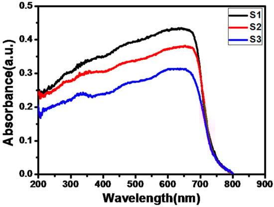 UV-Visible spectra of SrS/Bi2S3 synthesized by hydrothermal approach at 180 °C: S1, S2, and S3.