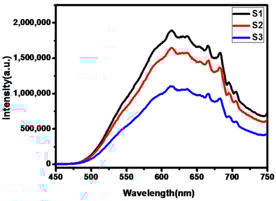 Photoluminescence (PL) spectroscopy has been broadly used to study the efficiency of charge carrier trapping, movement, and the rate of recombination in semiconductors [,,]. The room temperature photoluminescence (PL) measurement of prepared composite powders SrS/Bi2S3 was performed at 420 nm (Figure 5). The peak at 613 nm in the spectrum can be attributed to a high-level transition in SrS/Bi2S3 nanocrystallites []. However, the peak intensity in the case of sample S3 is less than S2 and S1. This may be an indication of Bi2S3 modification by SrS, which is getting adhered to the surface or within Bi2S3 bulk. These defects can act as the recombination centres for photo-generated carriers. The less electron-hole recombination in Bi2S3 resulted in the increase of PL peaks intensity []. The PL peaks intensities of the powders decreased from samples S1 to S3 with the phase formation of SrS. It indicates that the electron hole recombination is inhibited with increases in SrS.