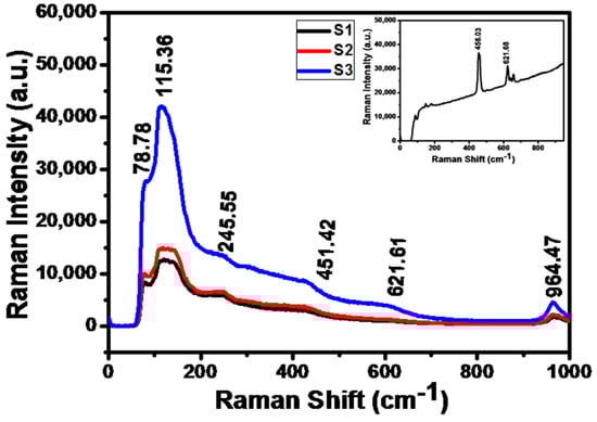 The room temperature Raman spectra of the SrS/Bi2S3 composite shown in Figure 6 and inset shows the Raman spectra of pure SrS. Raman spectroscopy is a vital tool for investigating the dopant concentration, identification of lattice defect, and orientation of crystals in the material []. Up to now, there was little work reported on the application of Raman spectroscopy on SrS nanostructures. The Raman spectrum exhibits four distinct vibrational peaks at about 78.78, 115.36, 245.55, and 964.47 cm−1, which are assigned to Bi2S3. The two absorption bands at 78.78 and 115.36 are attributed to the Ag mode, while 245.55 cm−1 is assigned to the B1g mode []. The peak at 965 cm−1 may be to the surface phonon modes of nanosized Bi2S3 []. However, peaks at 451.41 cm−1 and 615.12 cm−1 are ascribed to SrS, which is slightly shifted due to composite structure (inset of Figure 6). Sample S3 has a little shift and the intensity is stronger than S1 and S2. According to Campbell [], Raman scattering is considered to be very sensitive to the microstructures of nanocrystalline materials, which may lead to a shift, showing complete agreement with our results. The higher intensity of SrS/Bi2S3 composite (S3) in Raman was due to the good crystallinity of the material.