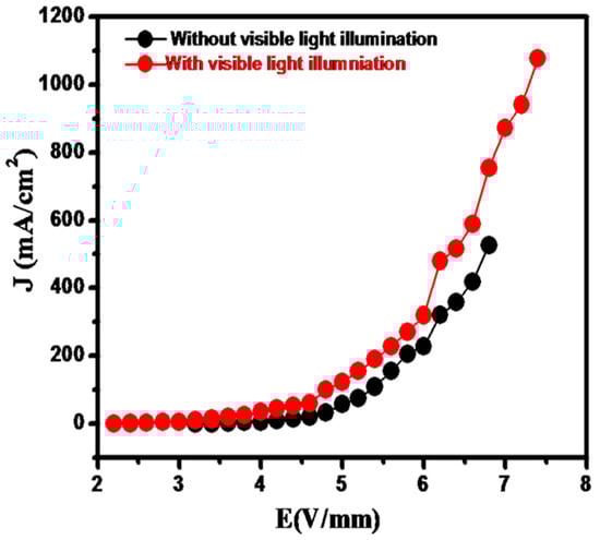 Interestingly, the F–N plot of the field emission current from the SrS/Bi2S3 displays a nonlinear relationship between ln (J/E2) versus 1/E for both, without light and with light illumination. This nonlinearity can be explained by the non-uniform geometries of the emitters. The F–N plot shows a gradual bend in the curve for the low electric field and then much more steeper change is observed in the high field region [,]. The nonlinearity of the F–N plot is dominated by geometrical variations of the protrusions in the SrS/Bi2S3. With increasing applied voltage, the number of emission sites increases, ultimately resulting in a rising slope as a function of the electric field. The linear behavior of the F–N curve was observed only at the highest electric field. Along with the emission characteristics, the emission current stability of the field emitters is an essential parameter in the context of their practical application. The emission current stability has been investigated at the base pressure of ca. 1 × 10−8 mbar.
